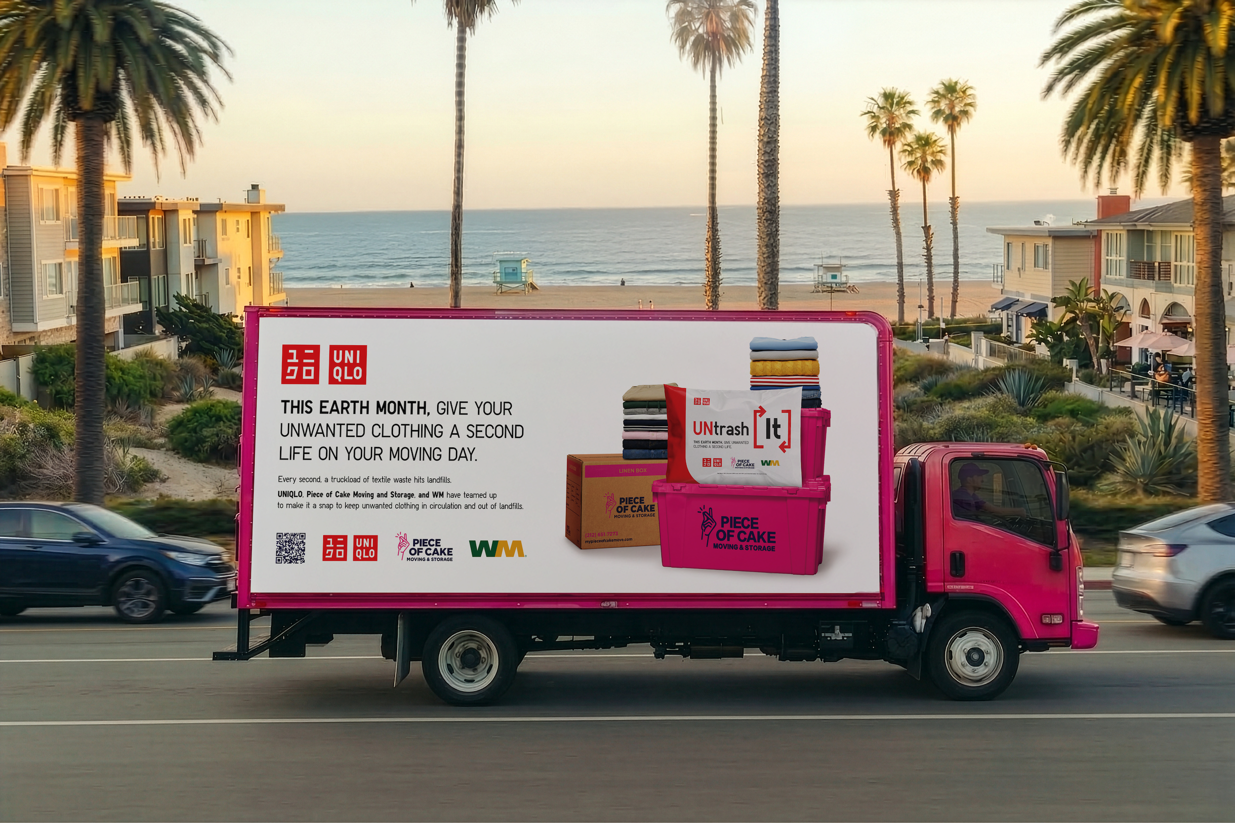 The initiative is called UNTRASH IT. Anyone moving with Piece of Cake during April receives a notification two days before their move — movers will have Uniqlo bags on the truck. Opt in, fill the bags with unwanted clothing, hand them over. That's it.